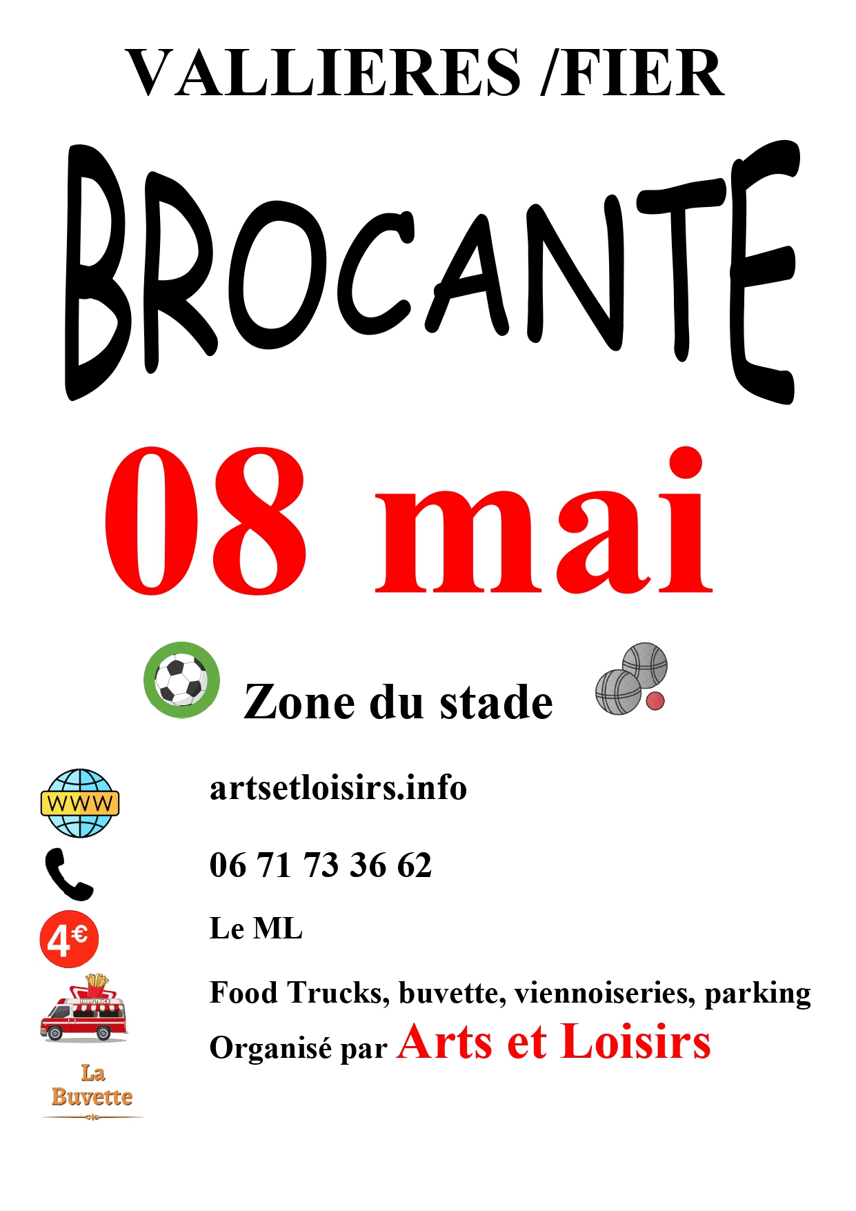 Brocante organisée par Arts et Loisirs, avec Food Trucks, buvette, viennoiseries et parking.