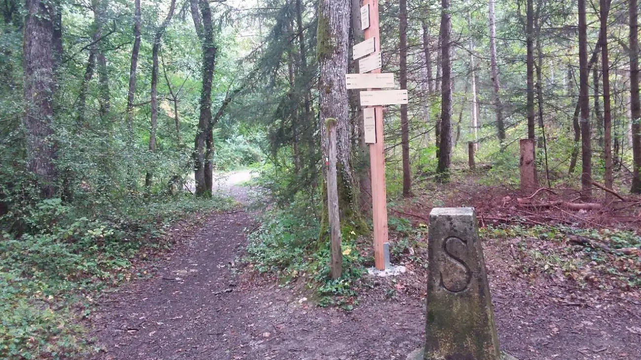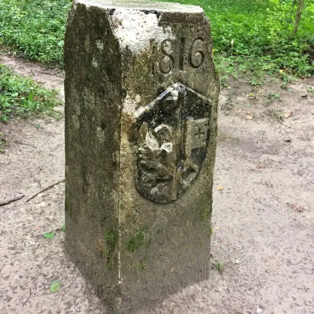 In 1815, Geneva was a member of the Swiss Confederation and was surrounded by the kingdoms of Piedmont-Sardinia and France. In 1860, Savoie was annexed to France.<br/>Along the border, we can still discover the border marker no. 1 which marks the western-most point of Switzerland . Lavishly carved and dating from 1816, it faces the eagle with outspread wings of the kingdom of Sardinia, on the Genevois coat of arms. It is a milestone on the old path leading from Chancy to Vuache, highly frequented in the 17th and 18th centuries and now fallen into disuse. A bit further on, 3 wooden staircases allow the coastal path to cross the 3 successive levels of submerging into the Rhône (terraces) carved in the fluvio-glacial alluviums.