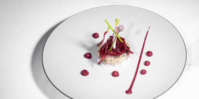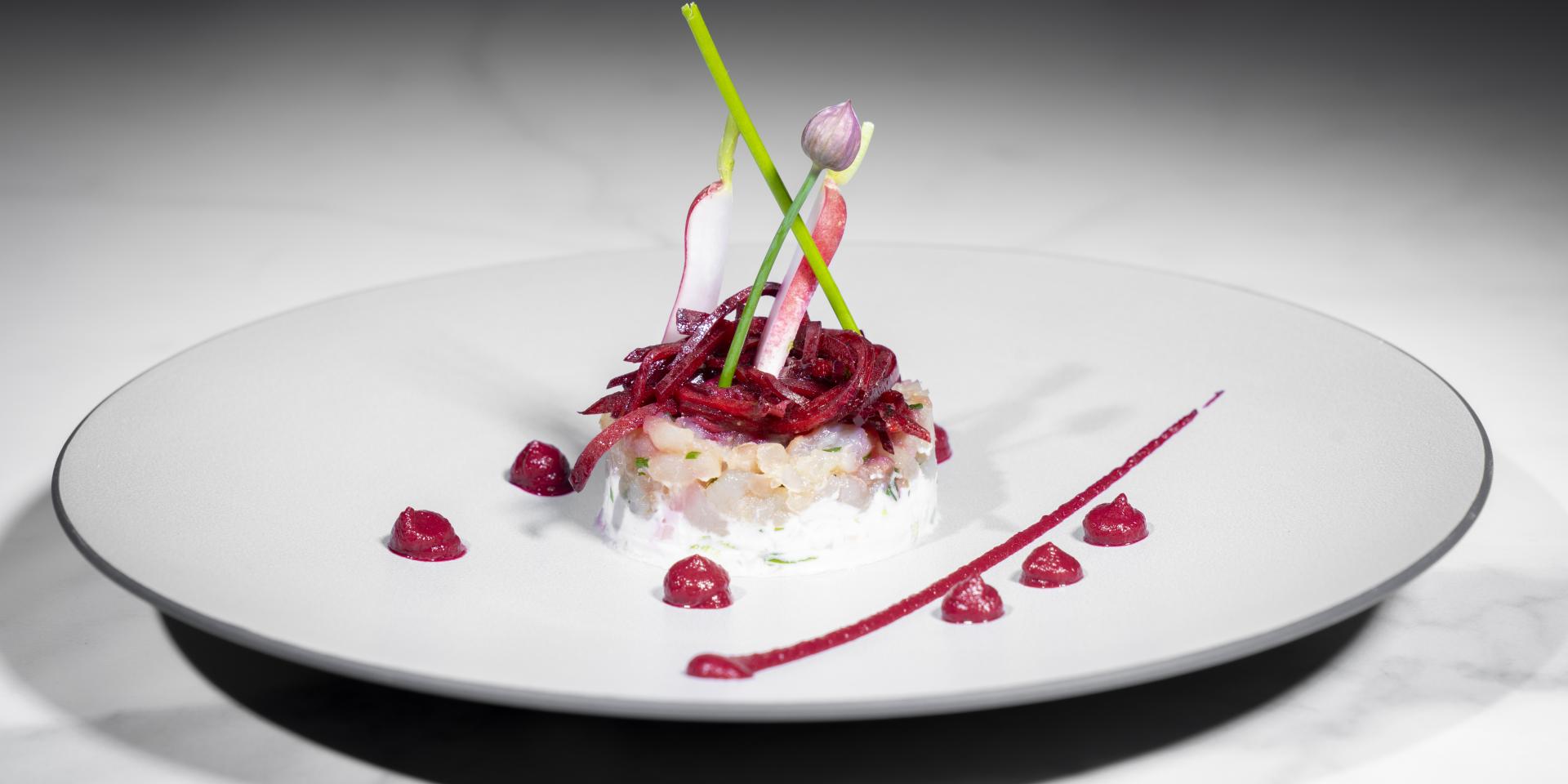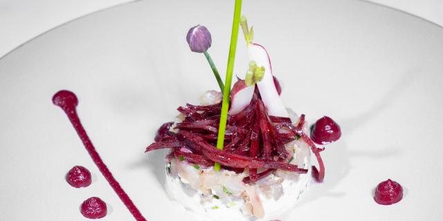 6. Dekorieren Sie den Teller mit einigen Punkten und Strichen Rote-Bete-Ketchup. Geben Sie oben auf den Tartar ein wenig der Rote-Bete-Julienne. Verzieren Sie weiter mit kleinen Stücken Schnittlauf und Radieschen.