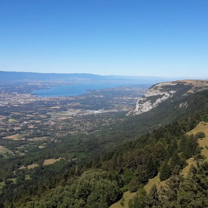 La Thuile is not an alpine pasture at the summit, so the view, of an excellent quality, is limited to the Genevois region, Lake Geneva and the Jura. In clear conditions you can see Lausanne.<br/>To the North-East the view focuses on the Salève, notably Le Grand Pitons and the cliffs of Collonges-sous-Salève.