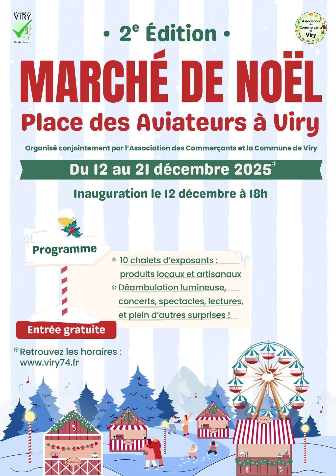 Le marché de Noël, place des Aviateurs, revient pour une deuxième édition, organisé conjointement par l’Association des Commerçants et la Commune de Viry. Rendez-vous du 12 au 21 décembre 2025, pour fêter ensemble, la magie de Noël !