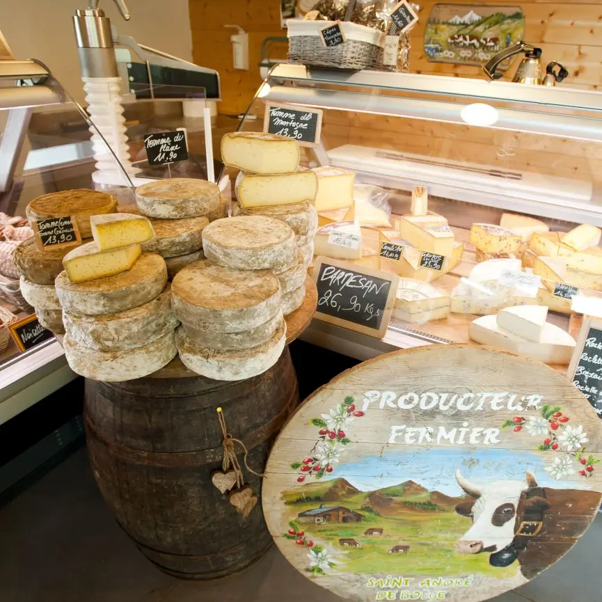 En plus de notre production de reblochon fermier, tomme fermière et abondance fermier, présence de produits de nos nombreux producteurs locaux et partenaires de la ferme : vin de Savoie, miel, produits du Lac Léman...