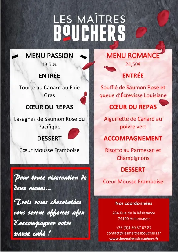 Pour toute réservation de deux menus, trois roses chocolatées vous seront offertes afin d'accompagner votre pause café.
